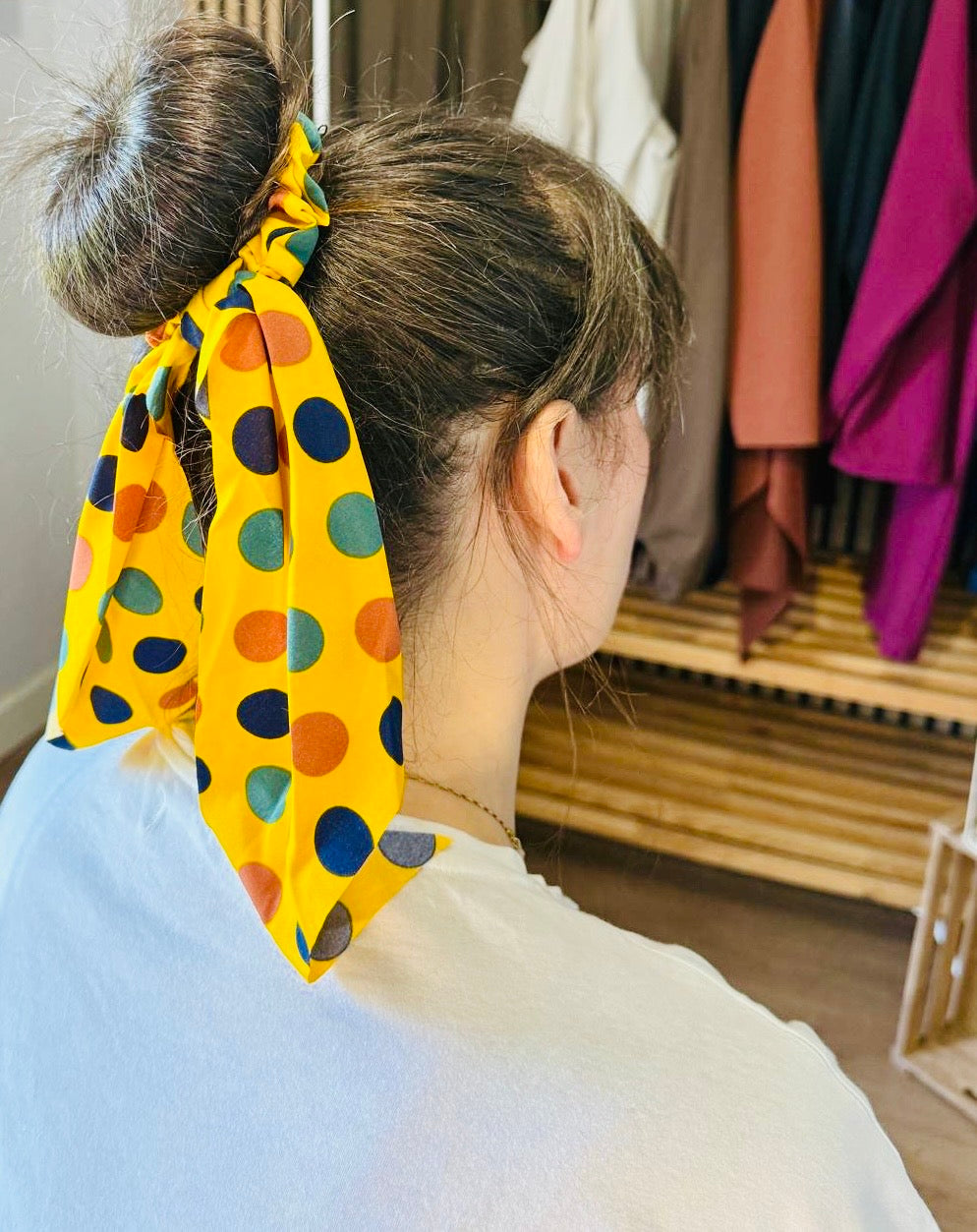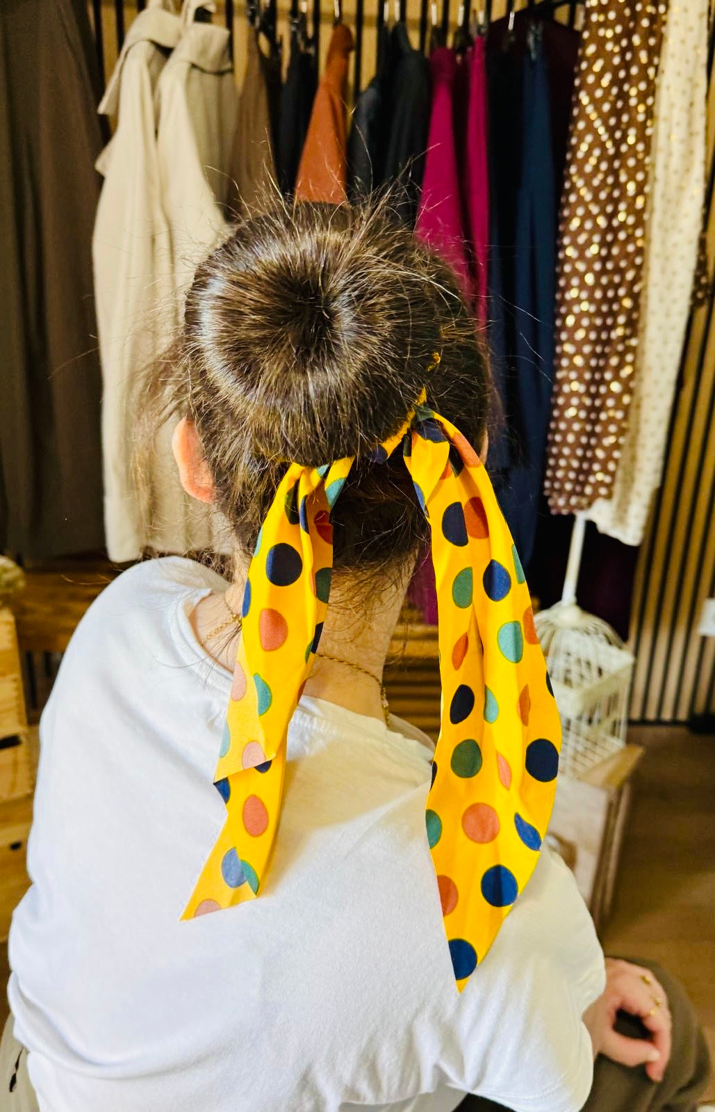 ✨ Dale un toque divertido y elegante a tus peinados con este coletero lazo estilo retro. Su tela ligera y su diseño con lunares lo hacen perfecto para realzar moños, coletas o semi recogidos. Ideal para darle color a tus looks del día a día o un aire chic a tus outfits más especiales.
