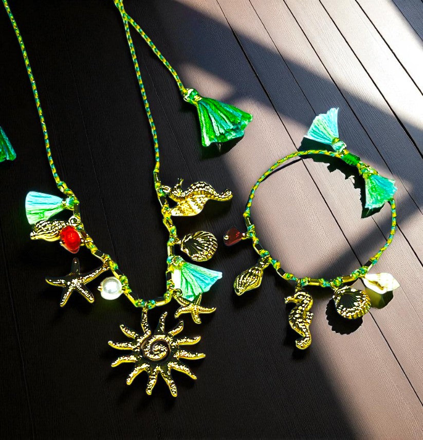 Cuerda verde agua, nudo corredizo y charms de acero dorado. Un collar para usar sin pensar demasiado: combina con todo, se ajusta fácil y le suma personalidad a lo que te pongas.