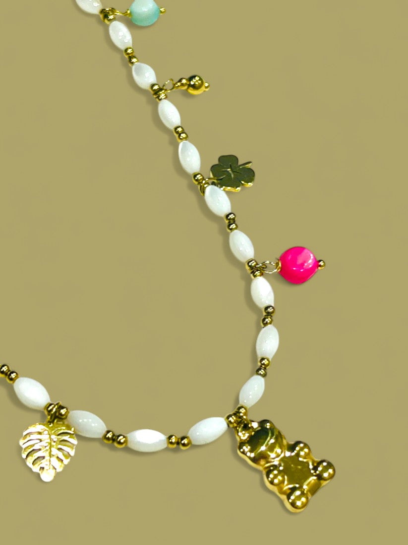 Este collar de acero dorado combina cuentas blancas con pequeños charms dorados que le dan un aire suave y femenino. Tiene un encanto casi nostálgico, como algo que no necesita llamar la atención para brillar.