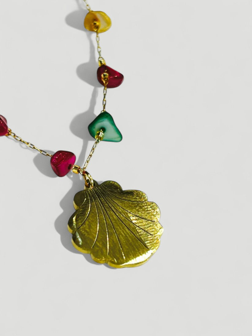 Este collar de acero dorado evoca la frescura y belleza del mar con su cadena delicada y cuentas de colores vibrantes. En su extremo, un charm en forma de concha dorada aporta un toque natural y elegante, ideal para quienes buscan un accesorio único y lleno de personalidad.