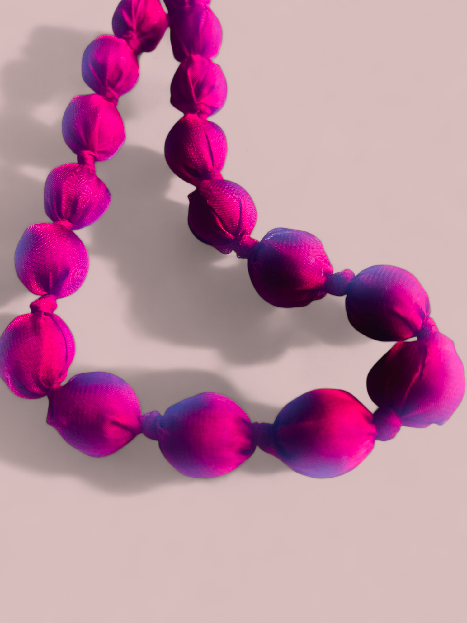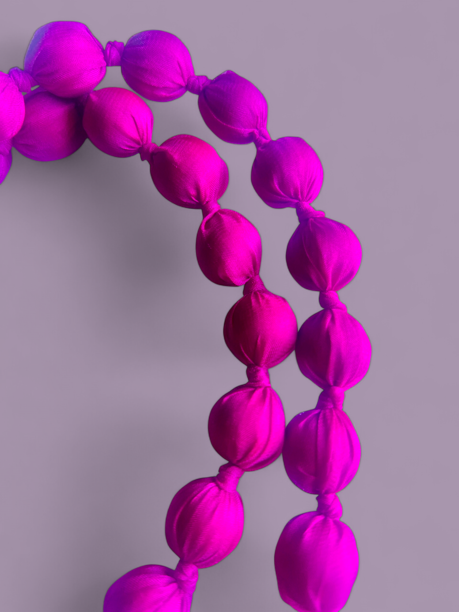El Collar Mafalda es un diseño textil único y original, disponible en fucsia y burdeos. Con 55 cm de largo, es el accesorio perfecto para darle un toque creativo y sofisticado a tu look.