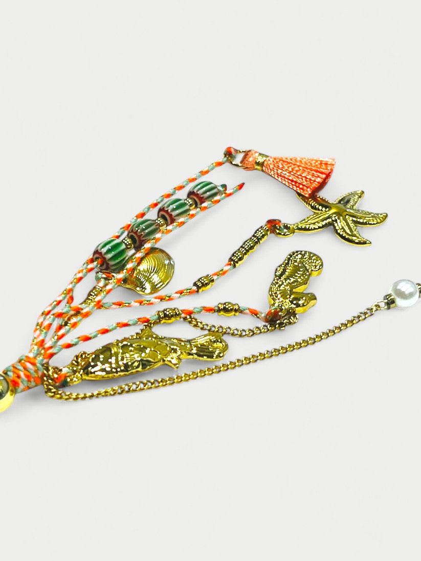 Un toque boho con alma vintage. Collar de cuerda rosa con charms dorados de acero inoxidable, inspirados en el mar. Su diseño evoca los collares de perlas de los años 50, en una versión liviana, fresca y actual.