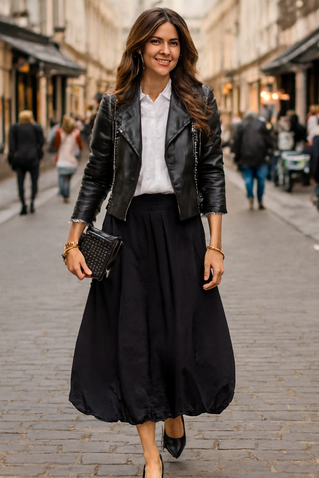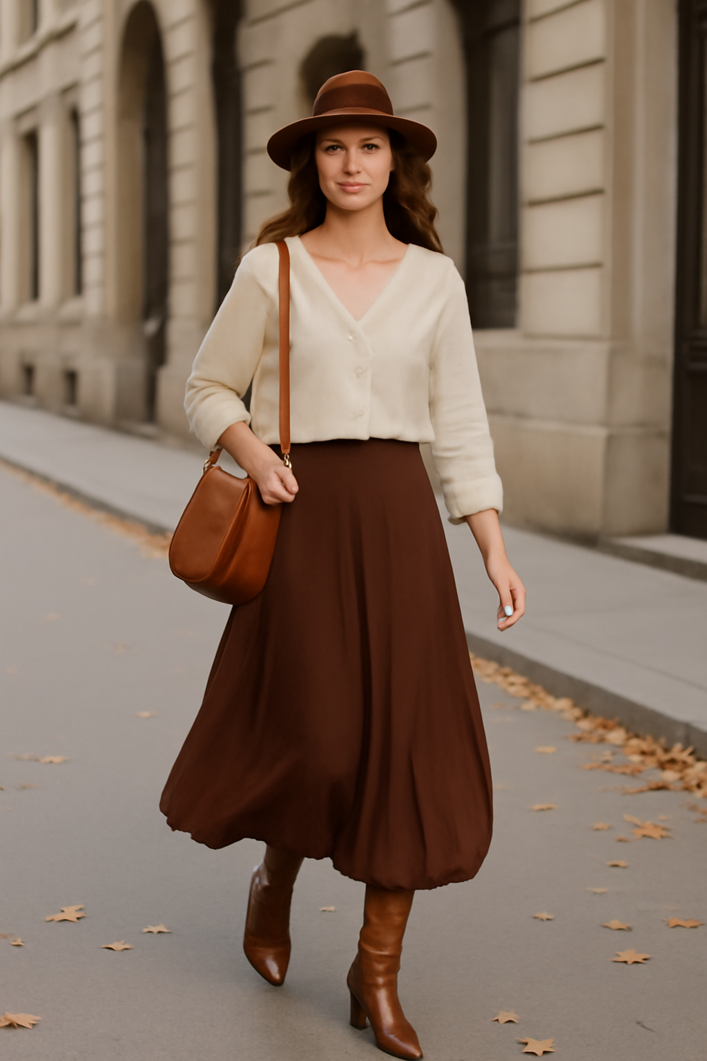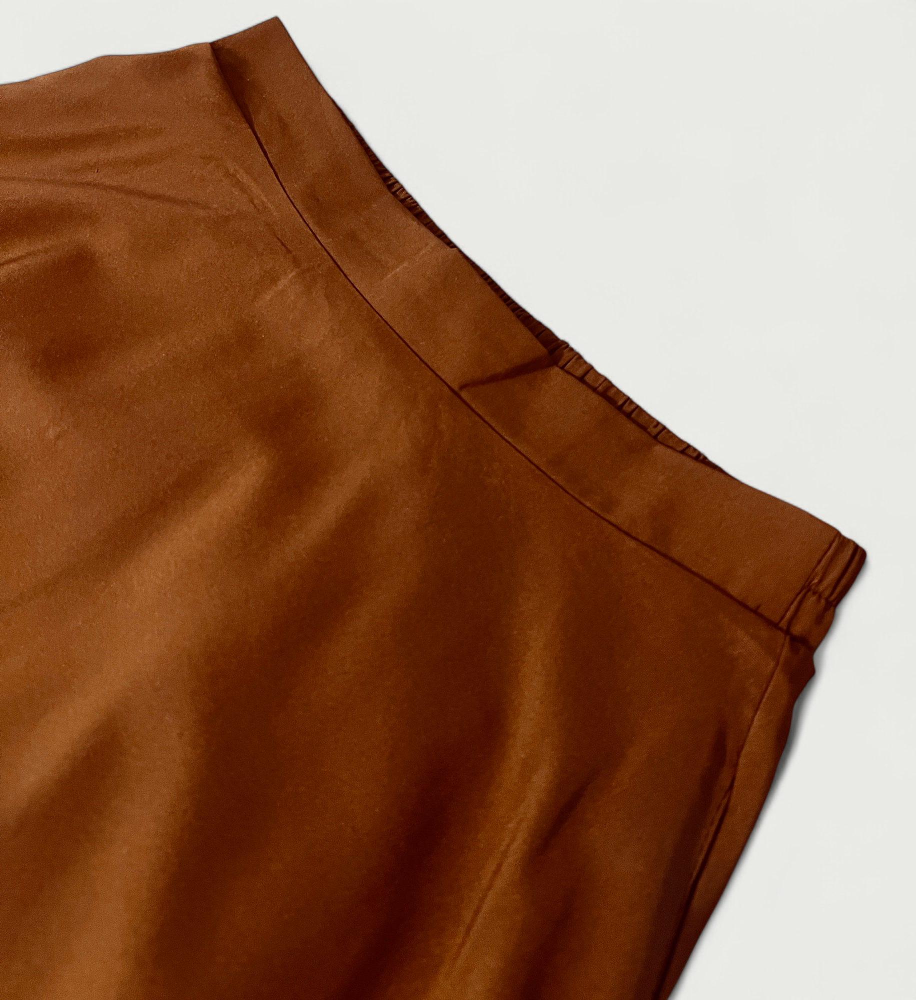 Falda boho chic Globo con bolsillos, en colores negro y chocolate. Confeccionada en un tejido suave y fluido con un toque elástico, se adapta a la silueta aportando caída y movimiento. Perfecta para looks de otoño.