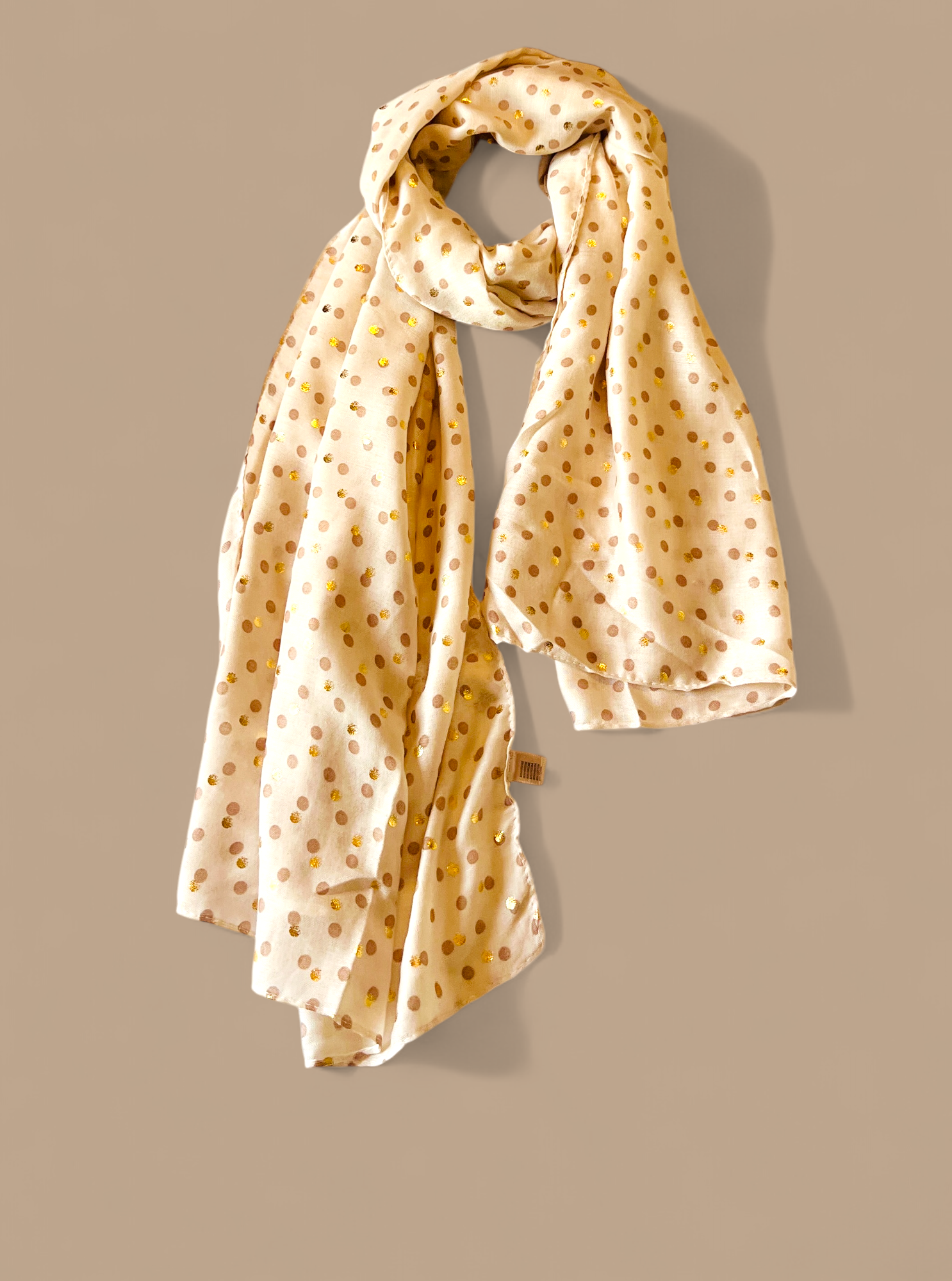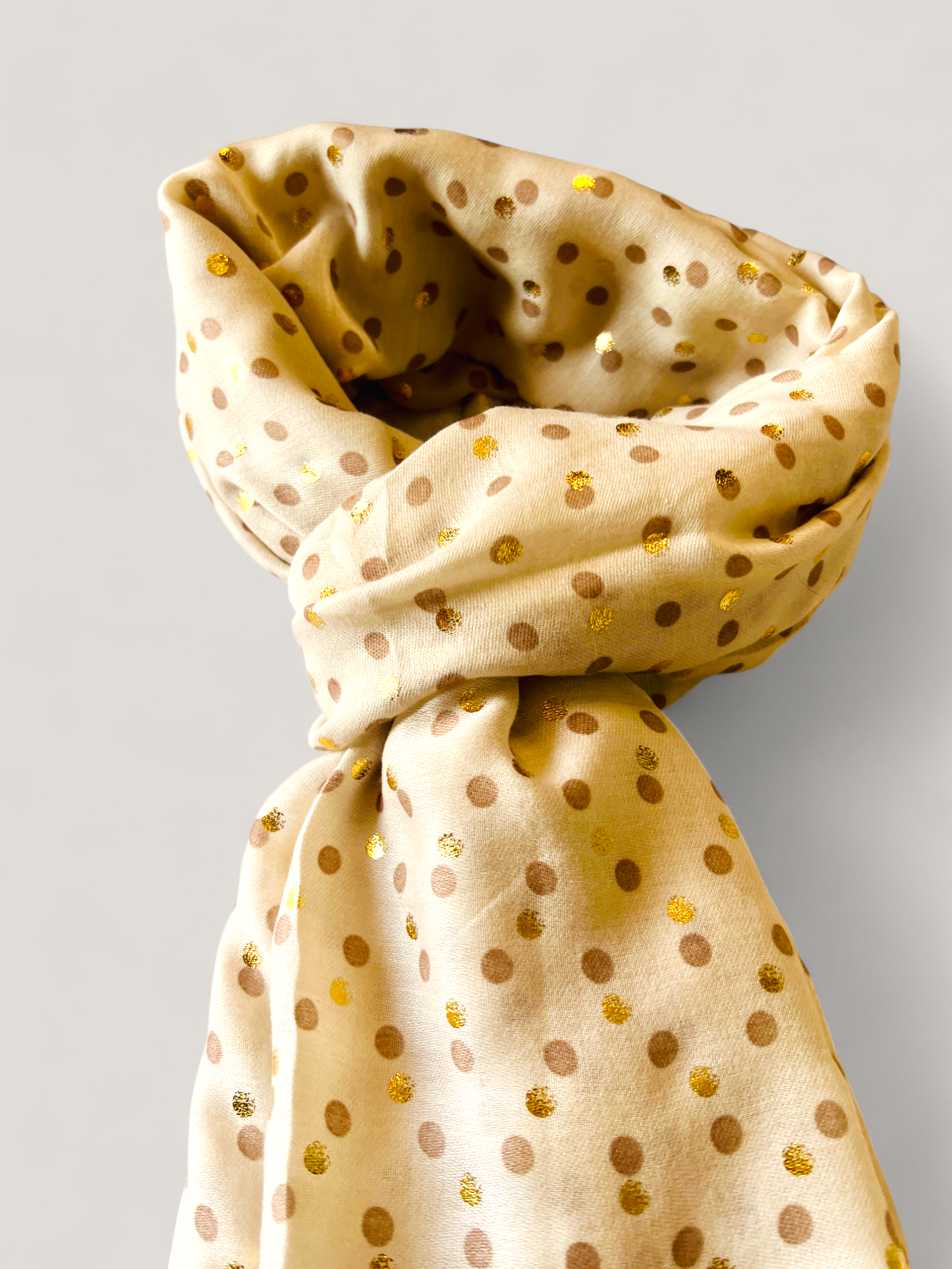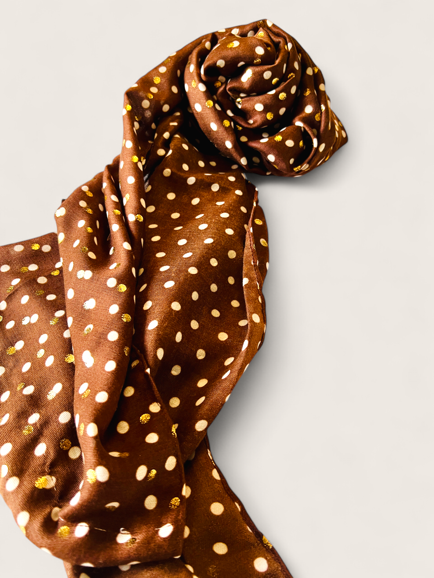 El Pañuelo Kelly combina elegancia y estilo atemporal. Disponible en beige y chocolate, ambos con delicados topos dorados que aportan un toque sofisticado y luminoso.