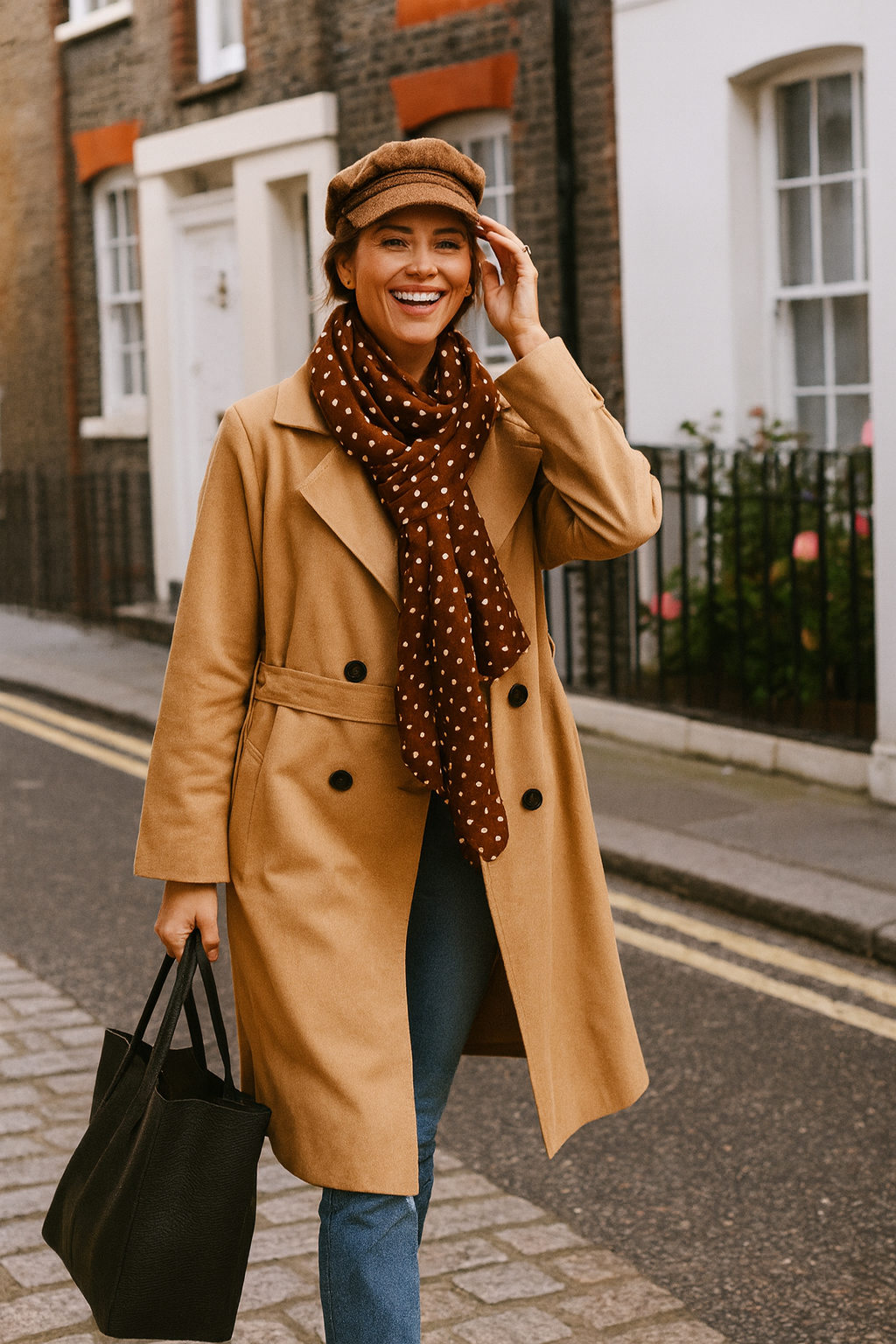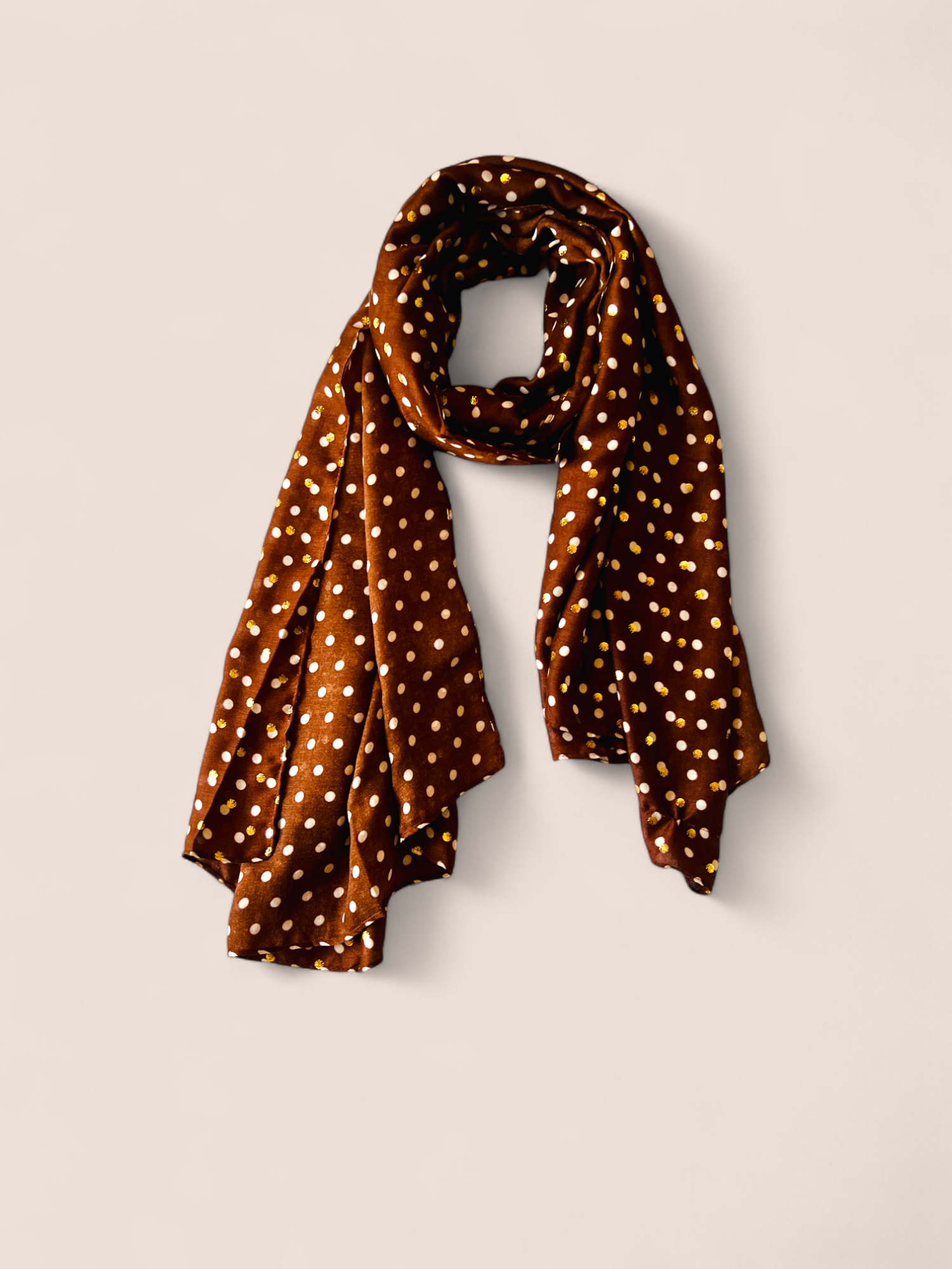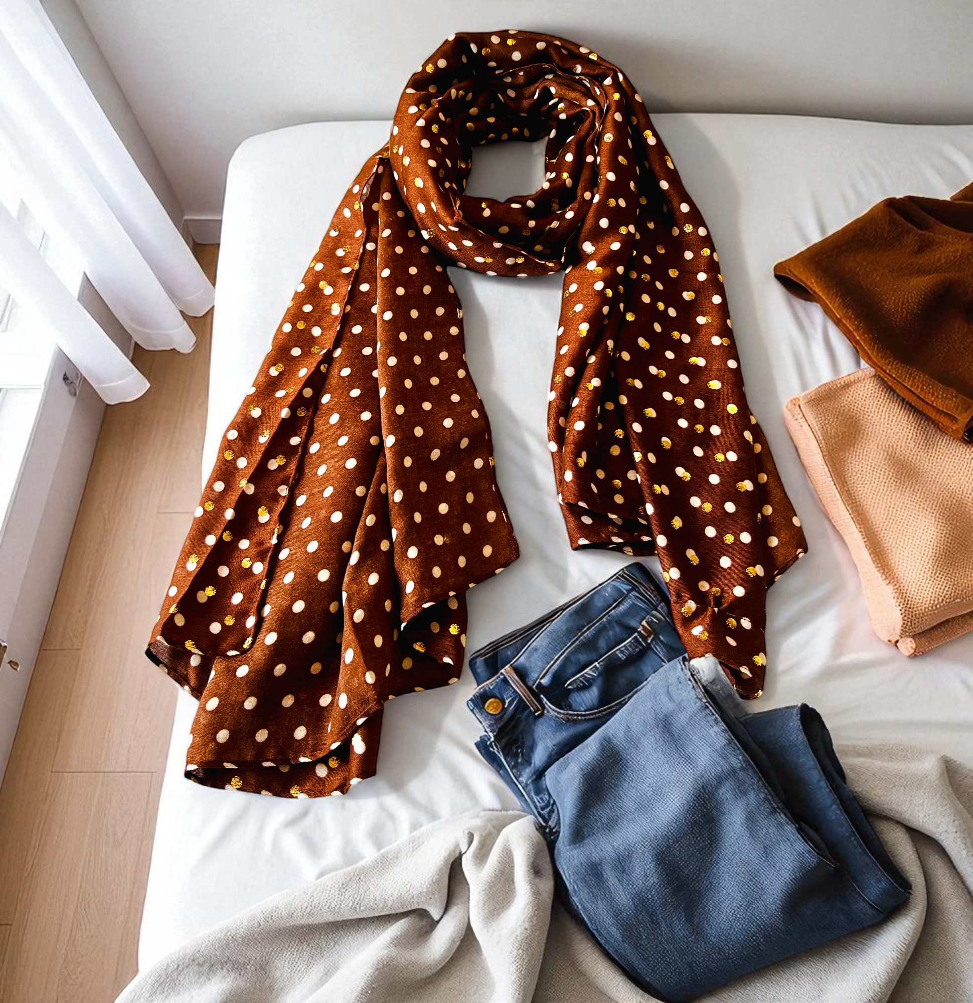 El Pañuelo Kelly combina elegancia y estilo atemporal. Disponible en beige y chocolate, ambos con delicados topos dorados que aportan un toque sofisticado y luminoso.
