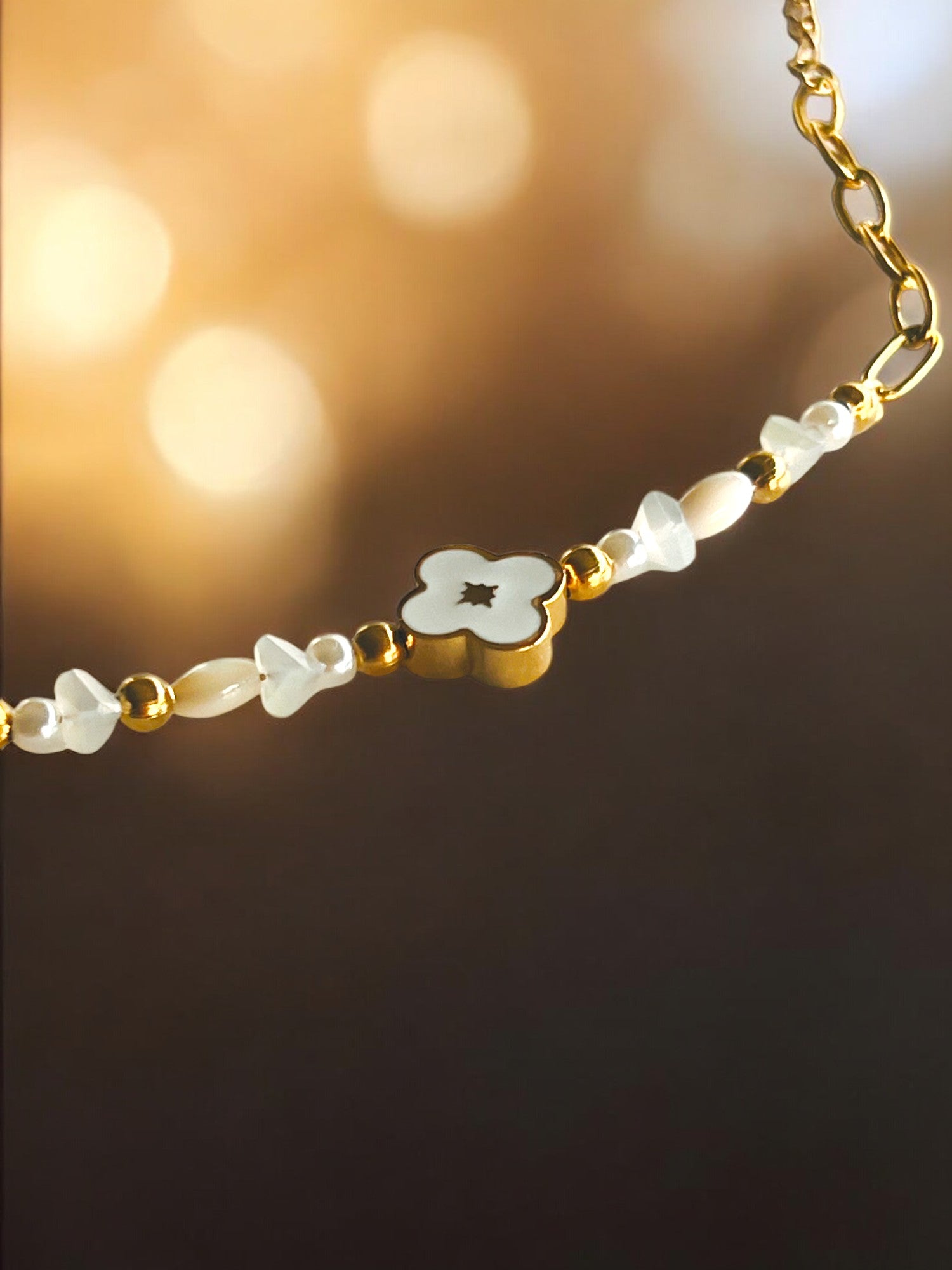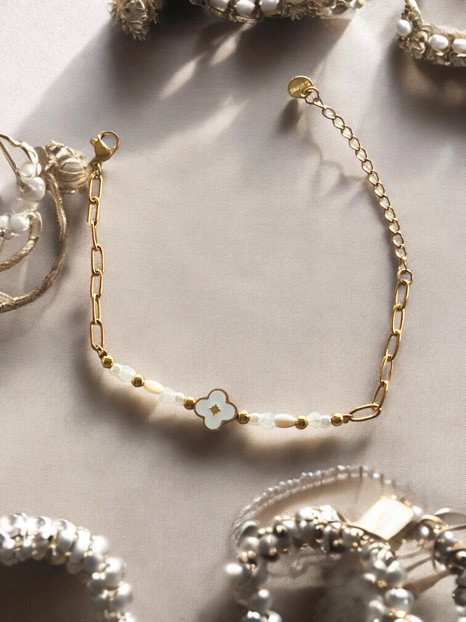 Esta pulsera dorada de acero, con cuentas blancas y un delicado dije en forma de flor con bordes dorados, aporta un estilo elegante y versátil. Su diseño sencillo y sofisticado se adapta perfectamente a tu día a día o a esos momentos especiales. ¡Un detalle perfecto para regalar o para ti!